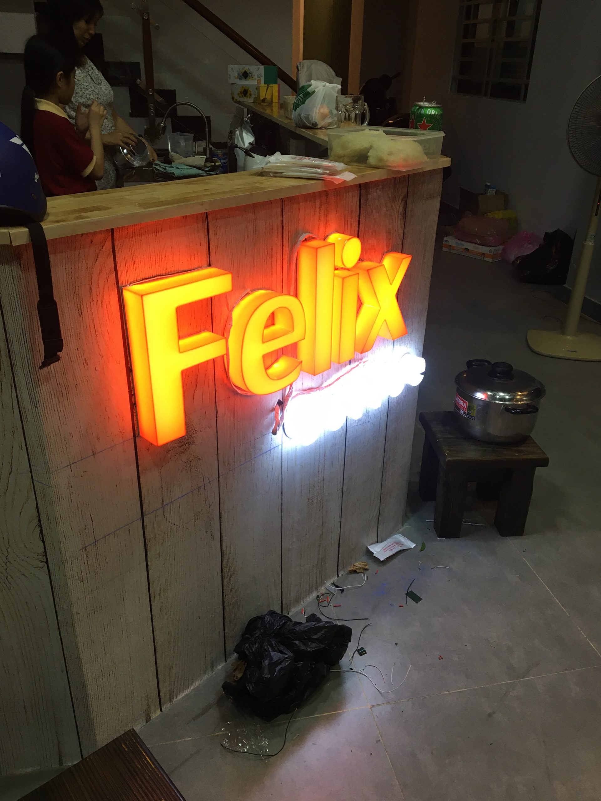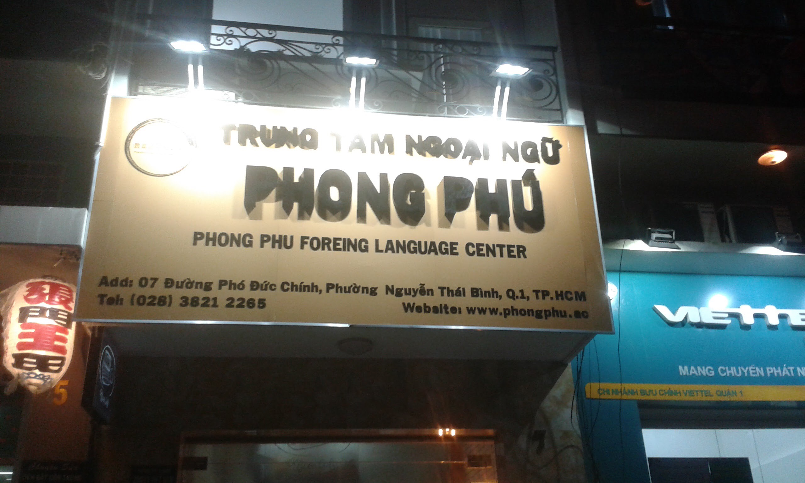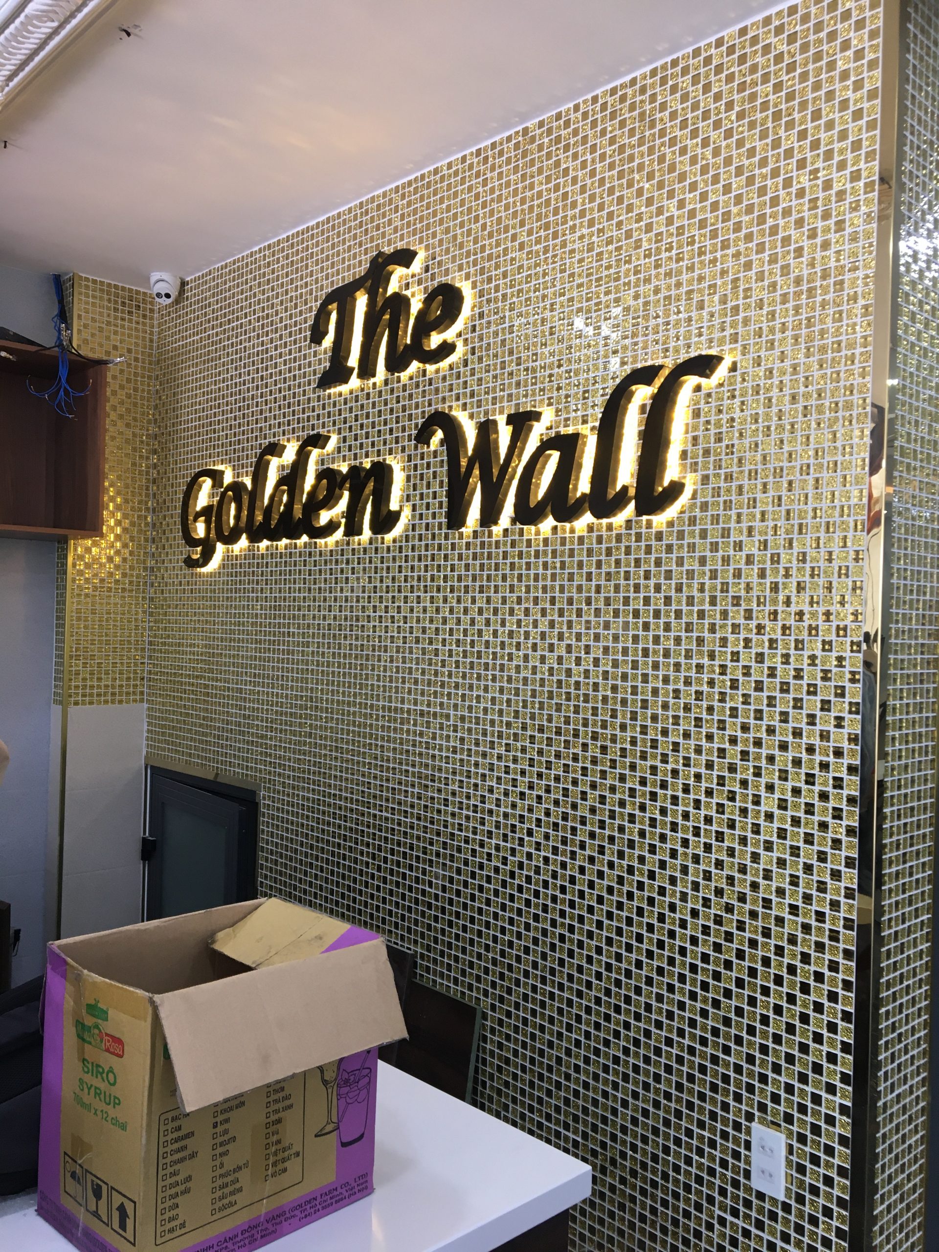 • Bảng hiệu alu chữ nổi Inox vàng sáng đèn hắt chân